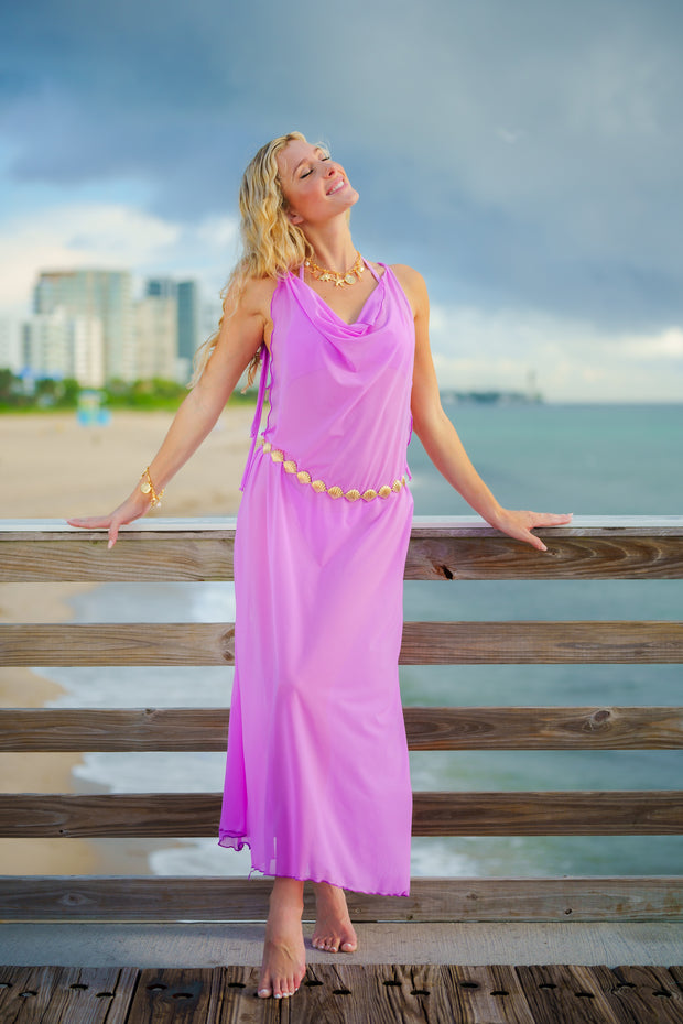 This sheer maxi dress is the perfect combo of sexy and modest. It offers nice leg coverage and we love the cowl neck detail. The straps tie to your liking so you can make it shorter or longer.